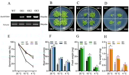 Identification of RmMYB44 overexpression tobacco and comparison of chilling tolerance of WT and OE during seed germination. (A) Detection of transgenic tobacco using agarose gel electrophoresis. (B–D) Phenotypes of WT and transgenic tobacco under treatments of 25 °C, 15 °C, and 4 °C. (E) Germination rate of WT and transgenic tobacco under treatments at 25 °C, 15 °C, and 4 °C. (F–H) Root length, fresh weight, and dry weight of WT and transgenic tobacco under treatments at 25 °C, 15 °C, and 4 °C. Data are presented as mean ± standard deviation. Different lowercase letters indicate statistically significant differences (p < 0.05).