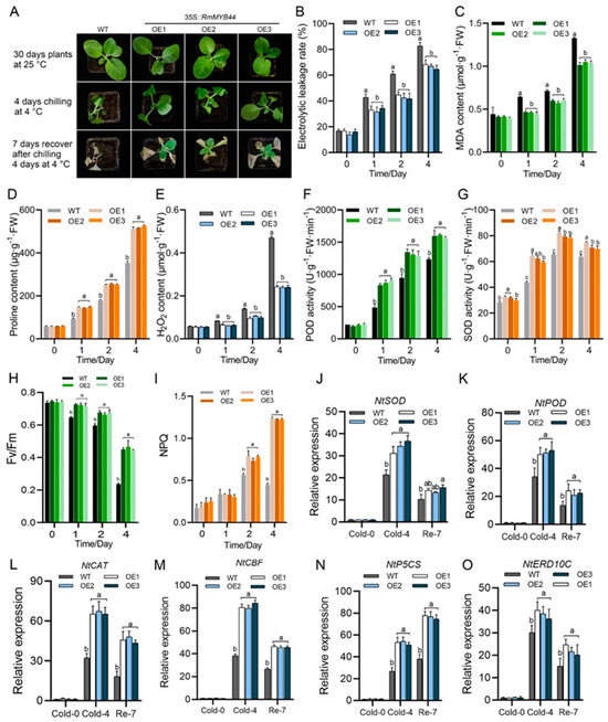 To further analyze the effect of the RmMYB44 overexpression on tobacco growth under low-temperature stress, the 30-day-old WT and the transgenic tobacco plants were exposed to 4 °C for 4 d. The plant growth, physiological indices, and stress-related gene expression were evaluated. The results indicated that both the transgenic and WT plants exhibited clear wilting symptoms under prolonged chilling stress, with the transgenic plants demonstrating significantly better resilience. On the fourth day, the WT plants exhibited lodging, with the leaves becoming soft and drooping, whereas the transgenic plants maintained better growth. After 7-day rewarming, the WT plants were nearly dead, whereas the transgenic plants began growing new leaves, indicating that RmMYB44 overexpression significantly improved the chilling tolerance (Figure 4A). The low temperatures suppressed the photosynthetic capacity of tobacco, as evidenced by decreased Fv/Fm and increased NPQ. Specifically, the Fv/Fm in OE lines decreased from 0.74 to 0.44 after the 4-day chilling treatment compared to a reduction from 0.74 to 0.24 in WT, which was faster than OE lines significantly. The NPQ in transgenic tobacco increased from 0.22 to 1.23, while that of WT increased from 0.17 to 0.45, demonstrating a slower increase in OE lines (Figure 4H,I). Additionally, the RmMYB44 overexpression significantly reduced the accumulation of reactive oxygen species, with lower electrolyte leakage rates and reduced levels of H2O2 and MDA in OE lines than in the WT (Figure 4B–E and Figure S2A). The enzyme activities related to active oxygen scavenging, such as CAT and POD, and the proline content were significantly higher in the overexpressing plants. The expression levels of NtSOD, NtPOD, NtCBF, NtP5CS, and NtERD10C were also significantly upregulated in OE lines (Figure 4J–O). These findings suggested that the RmMYB44 overexpression significantly enhanced the chilling tolerance in tobacco.