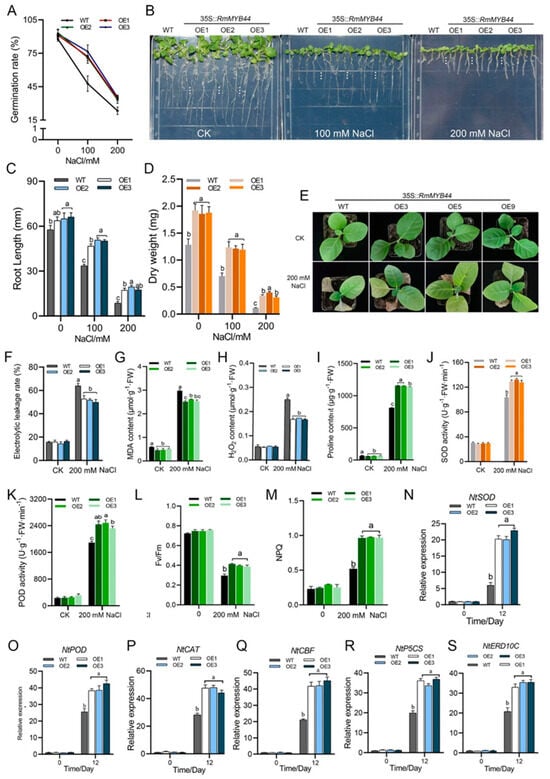 The qRT-PCR results demonstrated that RmMYB44 responded to both chilling and salt stresses (Figure 2B). To further investigate the role of RmMYB44 under salt stress, sterilized WT and transgenic tobacco seeds were sown on a 1/2 MS solid medium containing varying concentrations of NaCl. The germination rate of WT tobacco decreased from 87.79% to 46.88% under 100 mM of NaCl, whereas the germination rate of transgenic tobacco was 72.22%. With the increase in NaCl by 200 mM, the WT germination rate decreased to 23.33%, whereas the transgenic tobacco maintained the germination rate of approximately 34.44% (Figure 5A). Furthermore, the root length and dry weight of tobacco overexpressing RmMYB44 were significantly greater than those of WT tobacco (Figure 5B–D). At 100 mM of NaCl, the root length of WT decreased to 33.5 mm, compared to 49.19 mm in OE lines. At 200 mM of NaCl, the WT root length was 8.63 mm, while the OE lines had a root length of 18.05 mm (Figure 5C). These results also indicated that although both the transgenic and WT tobacco demonstrated reduced germination rates with the increasing NaCl concentrations, the transgenic tobacco exhibited higher germination rates than WT. Therefore, RmMYB44 overexpression could enhance the salt tolerance in tobacco during the seedling stage.