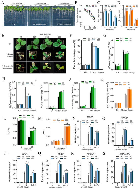 To understand the role of RmMYB44 in plant drought tolerance, the tobacco seeds of both the transgenic plants overexpressing RmMYB44 and the WT plants were treated with 0, 100, and 200 mM of mannitol. The results indicated that compared to WT, the transgenic tobacco plants exhibited higher germination rates, longer root lengths, and greater dry weights (Figure 6A–D). After 12 d of drought treatment, the transgenic plants presented less wilting and greener leaves (Figure 6E). The drought conditions inhibiting the photosynthetic ability affected both Fv/Fm and NPQ in OE lines, similar to the effects observed with chilling and NaCl treatments (Figure 6L,M). After 12 d of drought, the plants were re-watered, revealing that the OE lines resumed growth and produced new leaves after 7 d, whereas the WT plants almost died and failed to recover. In addition, the activities of CAT, POD, and SOD, as well as the proline content, increased significantly in the transgenic plants (Figure 6J,K and Figure S1B), whereas the accumulation of reactive oxygen species was notably reduced under 200 mM mannitol treatment (Figure 6F–K and Figure S2B). The expression levels of NtSOD, NtPOD, NtCBF, NtP5CS, and NtERD10C were also significantly upregulated (Figure 6N–S). These results suggested that the overexpression of RmMYB44 substantially enhanced drought tolerance in tobacco.