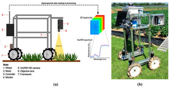 In this study, for the development of an optimal model to predict the amount of fertilizer applied, a ground-based hyperspectral imaging system module was implemented, capable of assessing the growth status of field-cultivated garlic. The ground-based hyperspectral imaging system module comprised a hyperspectral camera and a stable field-driving module. The selection of the hyperspectral camera for this experiment considered the measurement wavelength range, wavelength resolution, spatial resolution, and frame rate (FPS). The Pika Xc2 model (Resonon Inc., Bozeman, MT, USA) was selected for this study. The specifications for the camera are shown in Table 2.