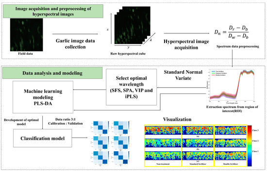 In contemporary agriculture, enhancing the efficient production of crops and optimizing resource utilization have become paramount objectives. Garlic growth and quality are influenced by various factors, with fertilizers playing a pivotal role in shaping both aspects. This study aimed to develop classification models for distinguishing garlic fertilizer application differences by employing statistical and machine learning techniques, such as partial least squares (PLS), based on data acquired from a ground-based hyperspectral imaging system in the agricultural sector. The garlic variety chosen for this study was Hongsan, and the fertilizer application plots were segmented into three distinct sections. Data were acquired within the VIS/NIR wavelength range using hyperspectral imaging. Following data acquisition, the standard normal variate (SNV) pre-processing technique was applied to enhance the dataset. To identify the optimal wavelengths, various techniques such as sequential forward selection (SFS), successive projections algorithm (SPA), variable importance in projection (VIP), and interval partial least squares (iPLS) were employed, resulting in the selection of 12 optimal wavelengths. For the fertilizer application difference model, six integrated vegetation indices were chosen for comparison with existing growth indicators. Using the same methodology, the model construction showed accuracies of 90.7% for PLS. Thus, the proposed model suggests that efficient regulation of garlic fertilizer application can be achieved by utilizing statistical and machine learning techniques.