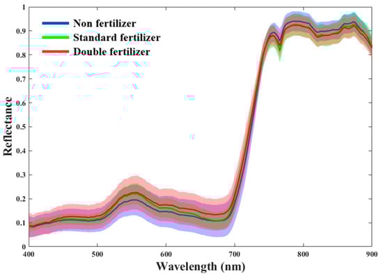 Figure 4 depicts the spectra obtained from the hyperspectral images acquired using a ground-based hyperspectral imaging system module for garlic crops cultivated in open fields. The blue line shows the average spectrum from untreated garlic crops, the green line from those grown with standard fertilization, and the red line from crops receiving double fertilization. The overall spectral pattern was confirmed to be similar to that reported in existing studies [38]. The sharp spectrum change observed in the range of 680~720 nm has been confirmed to be attributed to the related red edge reflection [39]. The difference in average spectrum between 550 nm and 750 nm is attributed to variations in chlorophyll absorption and red shift due to differences in fertilization. This spectrum characteristic indicates variations in carotenoid absorption (550 nm) and chlorophyll absorption (750 nm) [40]. However, with the given spectral data alone it is challenging to clearly discern such differences. In other wavelength regions, distinguishing spectral differences is difficult, and even in shadow graphs, overlapping regions complicate the discrimination of fertilization differences in garlic. Hence, achieving more precise results would necessitate additional data processing and analysis techniques.