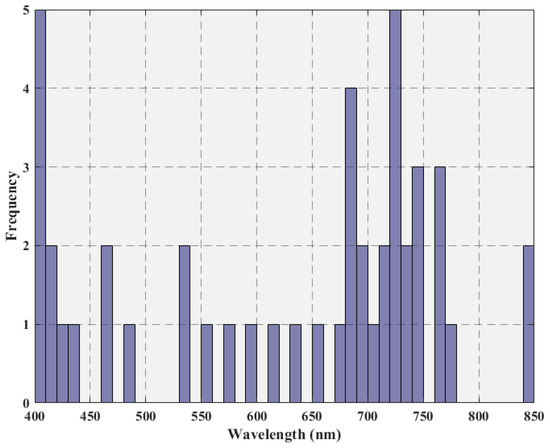 To enhance data processing efficiency the SFS, SPA, VIP, and iPLS methods were employed to identify the effective wavelength bands within the VIS/NIR spectrum of crops captured from ground-based hyperspectral imaging. The wavelength ranges of 525–725 nm were found to be consistent with previous studies related to nitrogen stress [41]. Additionally, the wavelength at 548.4 nm is specifically associated with chlorophyll absorption, which is critical for assessing plant health and growth [42]. Using each method, 12 optimal wavelengths that effectively described the spectral data were identified. Selecting too few wavelengths can oversimplify the model, while selecting too many can increase computational complexity and introduce noise. Therefore, the decision to select 12 optimal wavelengths in this study reflects a careful balance aimed at capturing spectral information comprehensively, ensuring robustness across various selection methods, and prioritizing information to enhance model performance. Figure 5 is a frequency histogram showing how often each wavelength appears based on 12 optimal wavelengths adopted from four different methods. Table 5 lists the optimal wavelengths obtained using each method. Twelve different optimal wavelengths (405.9, 416.4, 463.9, 532.6, 548.4, 661.9, 688.3, 725.2, 741.0, 764.8, 846.6, and 886.2) were selected. Of the 12 wavelengths obtained through the four methods, we selected 12 optimal wavelengths, prioritizing wavelengths that significantly affect plant growth, chlorophyll content, nitrogen stress and frequency. Furthermore, to explore the feasibility of utilizing low-cost multispectral cameras instead of expensive hyperspectral cameras in agricultural environments, we considered the full width at half maximum (FWHM) with intervals of ±3, 6, 9, and 12 nm around the selected wavelengths. This step ensures that our model can be adapted for practical, cost-effective applications in the field.