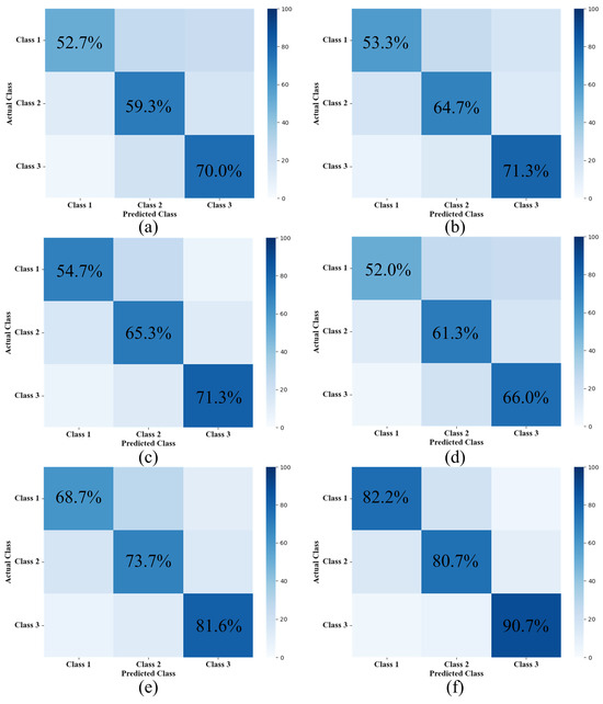 Confusion matrix for classification model based on fertilizer application at different wavelengths. (a) SFS; (b) SPA; (c) VIP; (d) iPLS; (e) optimal wavelength; (f) full wavelength.