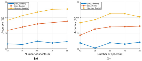 The results of the classification models built using the 12 optimal wavelengths selected by SFS, SPA, VIP, and iPLS methods were compared. After evaluating the accuracy of the classification models using the wavelengths selected by each method individually, a new classification model was constructed by integrating the 12 optimal wavelengths derived from the four methods. The classification model using the integrated optimal wavelengths showed higher accuracy than the models using wavelengths selected by individual methods. This result confirmed the effectiveness of the integrated optimal wavelengths in enhancing classification performance. However, it was observed that the performance of the classification model based on these optimal wavelengths was lower than that of the model using the full wavelength range. Figure 7 illustrates the accuracy of the classification model when using optimal wavelengths across different ranges. To evaluate the impact of the full width at half maximum (FWHM), the optimal wavelengths were adjusted to five different ranges: optimal, ±3, ±6, ±9, and ±12 nm. The impact of each range on the model’s performance was evaluated. In this study, datasets composed of 12, 35, 56, 76, and 95 spectra were used. Initially, the model built with only the 12 optimal wavelengths showed low accuracy, likely due to insufficient diversity of wavelengths, which prevented the model from learning appropriate patterns. However, as the spectral range was expanded, an improvement in model performance was observed. When the optimal wavelengths were selected at intervals of ±6 nm or more, accuracy levels comparable to those obtained using the full wavelength range were achieved. These results suggest that the improved stability of PLS-DA models can be attributed to the use of optimal wavelengths, providing enhanced robustness and reliability [44]. Consequently, selecting spectra based on optimal wavelengths and their respective ranges indicates that efficient data processing is achievable.