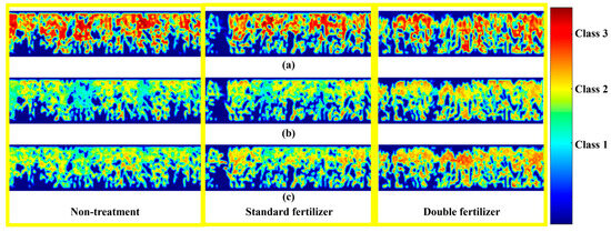 Figure 8 presents NDVI images, images employing a classification model based on the full spectrum dataset, and images utilizing a classification model derived from the optimal spectrum dataset. The primary objective was to discern and analyze differences in fertilization treatments among these images. NDVI images, which rely on specific wavelengths of light to estimate and compare chlorophyll content and plant vitality, did not conclusively show differences in fertilization treatments within the wavelength range considered. This indicates a potential limitation of NDVI images in capturing subtle variations attributed to fertilization treatments. However, the application of machine learning-based classification models, utilizing both the full spectrum and optimal spectrum datasets, effectively accentuated differences among fertilization treatments. These classification images amalgamated diverse optical and statistical techniques to discern more sensitive disparities, facilitating a more accurate understanding of plant growth and response to fertilization treatments. Consequently, the garlic crop model images utilized in this study can be effectively utilized to extract growth-related information concerning garlic crop fertilization treatments.