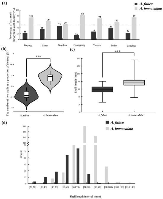 Population survey results of A. immaculata and A. fulica in 7 districts of Shenzhen city. (a) Proportions of A. immaculata and A. fulica in each district; (b) proportions of the two snails among the total number; (c) shell lengths of A. immaculata and A. fulica; (d) shell length distribution for A. immaculata and A. fulica (*** represents p < 0.01; the numbers on the bars represent the number of snails).