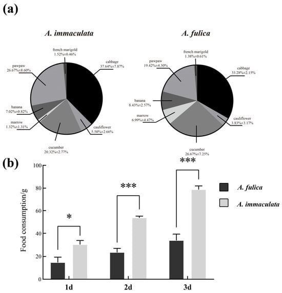 Comparison of feeding differences between A. immaculata and A. fulica. (a) Preferences of A. immaculata and A. fulica for food types; (b) food intake of A. immaculata and A. fulica (* represents p < 0.05; *** represents p < 0.01).