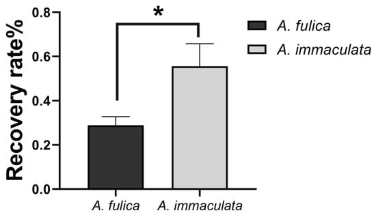 According to reports, the minimum adaptive temperature of the GAS is 15 °C, below which it enters a dormant state [7]. Therefore, we selected A. immaculata and A. fulica with shell lengths of 4–5 cm. Ninety A. immaculata were divided into three groups, with each group consisting of thirty snails, and three replicate experiments were conducted in total. The selection of A. fulica was performed as above. They were placed in a low-temperature incubator and kept at a stable temperature of 10 °C. After 24 h of low-temperature treatment, all snails became dormant and they were transferred to room temperature, and the recovery rate of the two species of snails from dormancy was calculated at 25°C for 24 h. The recovery rate of the two species of snails from dormancy was determined by their recovery from dormancy. Recovery from dormancy was judged by the snails’ gastropods protruding from the shell and whether they were feeding normally. Statistical analyses of the data were performed by one-way ANOVA using SPSS to determine the significance of differences.