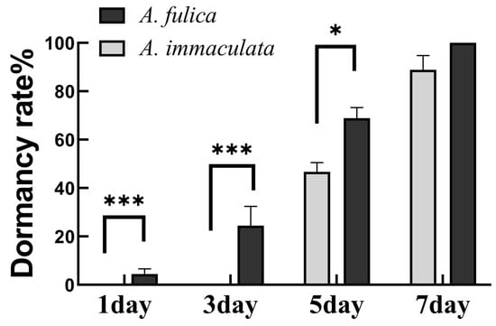 Dormancy rates of A. immaculata and A. fulica under drought resistance. (* represents p < 0.05, *** represents p < 0.01).