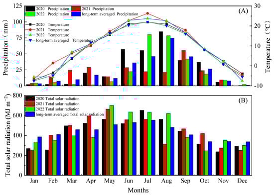 Monthly precipitation and temperature for 2020–2022 and long-term (A), monthly total solar radiation for 2020–2022 and the long term (B).