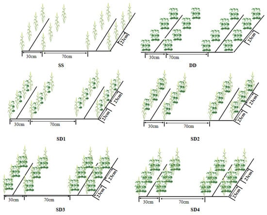 Forage sorghum and lablab bean were sown on 2 May 2020, 5 May 2021, and 8 May 2022. The spacing between forage sorghum plants was 23 cm, and row spacing was 30–70–30–70 cm (alternating row spacing). Lablab bean was planted next to forage sorghum in mixed cropping, and the cropping patterns of each system are shown in Figure 2. According to local fertilization recommendations, apply before sowing at rates equivalent to urea (N, 46%) 180 kg N ha–1 and diammonium phosphate 120 kg P ha–1, respectively. Forage crops were harvested on 10 September 2020, 11 September 2021, and 14 September 2022. Soil drip irrigation was used in the experiment, with 100 cm interval of drip tape and 30 cm interval of drip head and a plant growth stage irrigation volume of 2600 m3 ha−1 in 2020 and 2022 and 3300 m3 ha−1 in 2021.