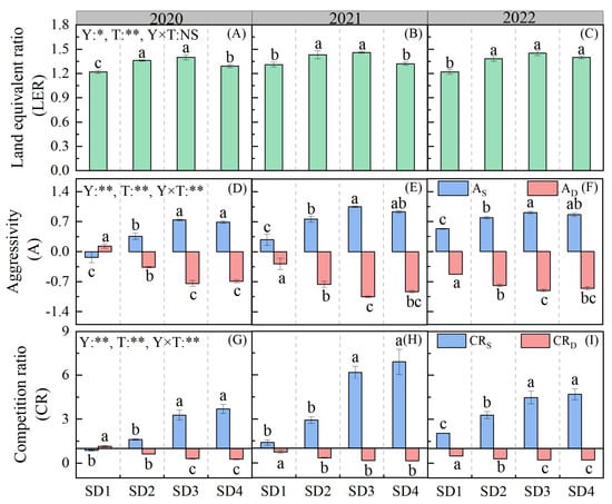 The land equivalent ratio (LER) was significantly affected by the year and treatment (Figure 3A–C). There were no differences in the LER between the SD3 and SD2 treatments; however, the LER of the SD3 and SD4 treatments were on average significantly higher (by 10.4%) than that of the SD1 treatment. The LER of the SD3 treatment obtained the highest value (1.44), showing an increase of 14.9% compared with that of the SD1 treatment (p < 0.05).