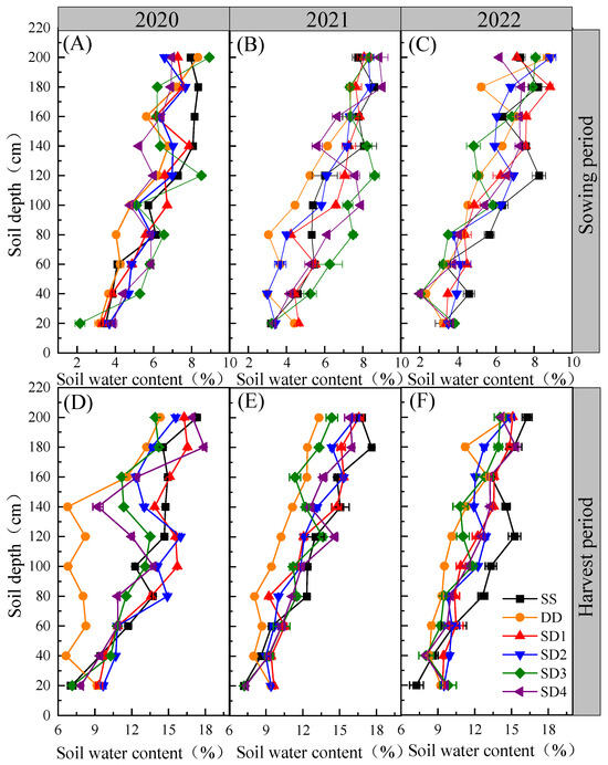 There was a significant difference in the soil water content (SWC) at the 0–200 cm soil layers from the sowing to the harvesting stage among the different treatments (Figure 4A–C; p < 0.05). In 2020, the SWC values were in the order SD1 (13.67%) > SS (13.04%) > SD2 (12.98%) > SD4 (12.13%) > SD3 (11.70%) > DD (9.31%) (Figure 4A). In 2021, the SWC values were in the order SS (12.71%) > SD1 (12.43%) > SD4 (12.26%) > SD2 (12.12%) > SD3 (11.43%) > DD (10.30%) (Figure 4B). In 2022, the SWC values were in the order SS (12.67%) > SD1 (11.99%) > SD4 (11.75%) > SD2 (11.62%) > SD3 (11.12%) > DD (10.54%) (Figure 4C).
