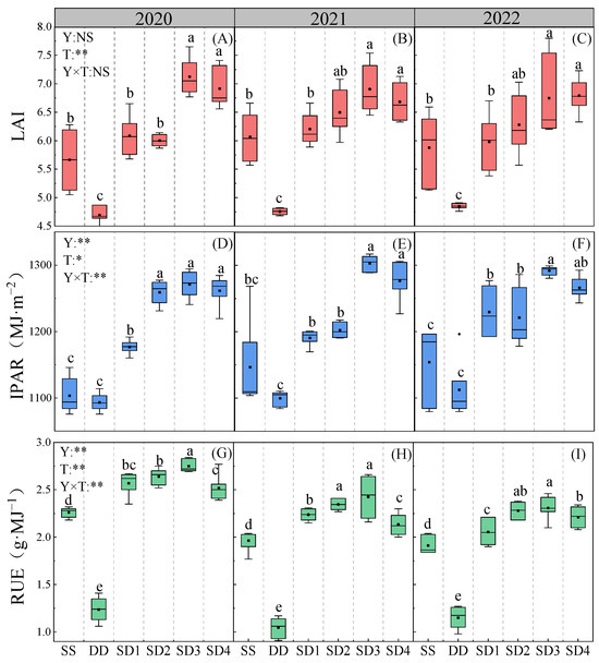 The intercepted photosynthetically active radiation (IPAR) and radiation use efficiency (RUE) were significantly affected by year, treatment, and year × treatment interaction (Figure 5D–I). In 2020, 2021, and 2022, there was no difference in the IPAR between the SD3 and SD4 treatments; however, it was significantly higher than SD1, SD2, SS, and DD (Figure 5D). The IPAR of the mixed treatments was significantly greater than that of the monoculture treatments, with an average increase of 6.9%, 4.7%, and 2.0%, respectively, in the mixed treatments compared with the monoculture treatments. In addition, in 2020, 2021, and 2022, the RUE in the SD3 treatment had significantly higher values, which were 2.75, 2.42, and 2.31 g·MJ−1, respectively, and increased by 22.7%, 24.7%, and 20.3% compared with the average values of SS, DD, SD1, SD2, and SD4 treatments (Figure 5G–I; p < 0.05), respectively.