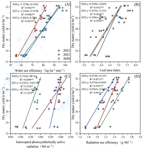 Regression analysis indicates that in the mixed cropping system of forage sorghum and lablab bean, WUE is linearly correlated with dry matter yield (R2 = 0.9023–0.9082, p < 0.01) (Figure 6A). Under the same conditions, the relationship between LAI, IPAR, RUE, and dry matter yield show similar results. Among them, the relationship between RUE and dry matter yield is the strongest (R2 = 0.8713–0.9553, p < 0.01) (Figure 6D), indicating that improving canopy structure and RUE in the mixed cropping system are effective ways to increase dry matter yield.