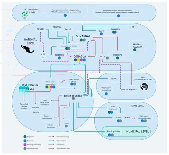Integrated agricultural water management (IAWM) must consider demographic, economic, technological, and environmental factors [], which implies the necessity of knowledge and understanding concerning the performance of the entities and/or programs involved in water management and governance. When analyzing these concepts separately, it is first necessary to consider management as a technical capacity for hydraulic construction, including the appropriate infrastructure for maintenance and rehabilitation; then, labor and hydraulic governance must be considered as the processes of technical and social control responsible for its proper or improper use []. Implementing water reforms on a global scale is quite challenging, and it is particularly hard in Mexico. Former experiences have demonstrated how hard it is to transform policy intentions into measurable actions. Back in 1989, CONAGUA identified ‘easy forms’ to diagnose the challenges in water supply and management. Although many of the data consider ‘common knowledge’ as the greatest obstacle, aligning the incentives of various stakeholders has proven to be a significant impediment delaying the implementation process []. The responsibility for water resources lies with various agencies, as a shown in Figure 1, which can result in deficiencies in administration or intersectoral communication, leading to the uncoordinated development and management of water resources and producing social conflicts, waste, and unsustainable development []. These issues highlight the need for clear guidance on executing the reform roadmap outlined in the 2030 Water Agenda.