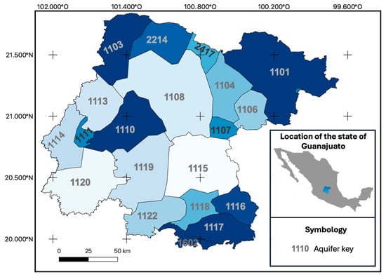 Geographic location of Guanajuato State and limitation of aquifers. The term “aquifer key” denotes the designation of the geographic boundary of the aquifer in question. The dark blue color signifies the average availability of the aquifer.