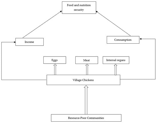 Empowering women is a tool that can provide women with power or control concerning decision-making regarding consumption, distribution, and sales. At the same time, empowerment is referred to as an indicator of access because when food is available through a woman, food will be accessible to every family member [37]. Their role is to maximize production while ensuring the quality and safety of the food within the household and control feed distribution. Hence, there are certain inequalities where men are given more food than women and children, which has a negative impact on the nutritional well-being of other family members who receive lesser quantities. Women’s empowerment can be achieved through the provision of knowledge and full control over village chicken production. Dumas et al. [15] in Kenya argued that no scientific evidence exists that women’s empowerment improves household welfare. Whereas in Bangladesh, it was reported that the empowerment of women significantly impacts the health, nutrition, education, and overall well-being of societies, as well as that of children and households. Improving village chicken production is interlinked with food and nutrition security, which positively impacts men and women per capita [38]. Figure 1 below indicates how village chickens can potentially contribute to achieving No Poverty and Zero Hunger in resource-poor communities.