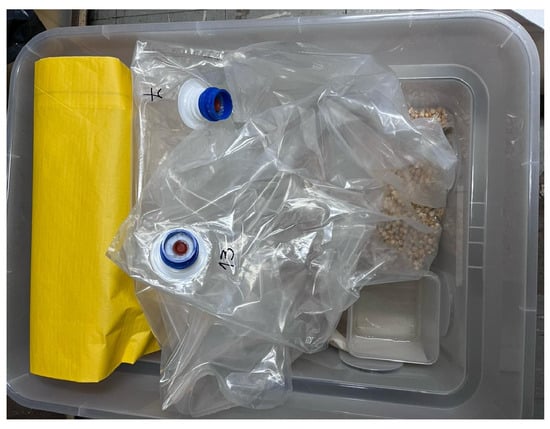 Despite the promising prospect for low-oxygen atmospheres, the literature on scaling up from laboratory conditions to agronomic or industrial applications is limited [30,31,32,33], especially for maize seeds [4,5]. This is not surprising in view of the technical challenges of the scaling-up procedures. For example, while laboratory experiments often utilize 0.3–0.5 L hermetically sealed glass jars [14,20,25,34], the storage of 25–50 kg of seeds requires using 30–60 L flexible containers [23,31,35]. To preserve hypoxic environments throughout the storage period, these containers must be highly hermetic, usually requiring plastic films combining one or two layers of an oxygen-barrier material (such as polyamide or ethylene-vinyl alcohol, EVOH) to avoid the entrance of oxygen. Also, they must have highly effective seals at the edges and valves, and resistance to mechanical damage [35,36,37]. The injection and purging procedures in these containers, additionally, require higher gas volumes and larger times to achieve initial oxygen concentrations near 0% than in small jars, elevating the operative complexity and cost of these experiments [19].
