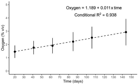 Oxygen concentration (% v/v) over time as predicted by the model (dotted line) after fitting experimental data (mean ± standard deviation, n = 17). The model equation includes only the fixed effects (slope p-value = 2.22 × 10−16). Conditional R2 represents the variance explained by the entire model, including both fixed and random effects.