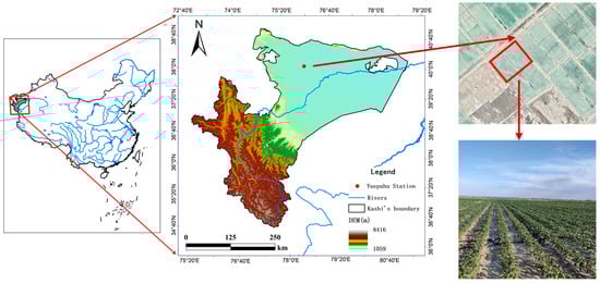 The research was conducted on an experimental farm (76°56′51″ E, 39°12′ 28″ N) in Yuepuhu County, Kashgar, Xinjiang, China (2021–2022). A map of the study area is shown in Figure 1. The soil in the cotton field was classified as silt loam with 0.40% organic matter, 0.30 g kg−1 available nitrogen, 11.5 mg kg−1 available phosphorus, 86 mg kg−1 available potassium, 17.3 g kg−1 total nitrogen, and 10.1 g kg−1 nitrogen. Other relevant soil characteristics (0–100 cm) before seeding are shown in Table S1. In order to ensure uniformity between test plots, soil and fertilizer management was not carried out at the experimental sites prior to the study. The climate of the region is characterized by a temperate, arid continental climate with hot summers and cold winters. The annual sunshine time of the test site is 2825 h, the annual average precipitation is 66.4 mm, and the evaporation is 1600 mm. Detailed information on the temperature, precipitation, and reference evapotranspiration (ET0) in the different growth stages of cotton can be found in Figure S1.