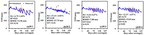 Calibration (2021) of the simulated and observed total soil water (TSW) in the 0–60 cm soil profile. The W1-W4 treatments had the same upper and lower limits of irrigation at the SQS and BLS. W1: 50–100% FC, W2: 60–80% FC, W3: 60–90% FC, W4: 60–100% FC.