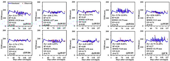 Validation (2022) of the simulated and observed values of total soil water (TSW) in the 0–60 cm soil profile. The dots represent the measured data, and the line represents the simulated values. Three lower irrigation limits of 55%, 65%, and 75% FC were set at the SQS, and three lower irrigation limits of 60%, 70%, and 80% FC were set at the BLS. Nine treatments (WD1–WD9, i.e., (a–i)) were completely combined, and CK (j) was the control treatment.