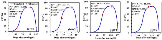 Simulation and measurement of the canopy cover (CC) curves for cotton under all treatments during the calibration period (2021). The W1–W4 treatments had the same upper and lower limits of irrigation at the SQS and BLS. W1: 50%–100% FC, W2: 60%–80% FC, W3: 60%–90% FC, W4: 60%–100% FC.