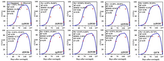 Simulation and measurement of canopy cover (CC) curves for cotton under all treatments during the validation period (2022). The dots represent the measured data, and the line represents the simulated values. Three lower irrigation limits of 55%, 65%, and 75% FC were set at the SQS, and three lower irrigation limits of 60%, 70%, and 80% FC were set at the BLS. Nine treatments (WD1–WD9, i.e., (a–i)) were completely combined, and CK (j) was the control treatment.