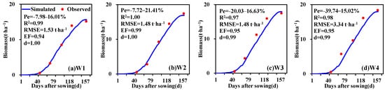 The development of the aboveground biomass of cotton was simulated and measured in all treatments during the calibration period (2021). The W1–W4 treatments had the same upper and lower limits of irrigation at the SQS and BLS. W1: 50–100% FC, W2: 60–80% FC, W3: 60–90% FC, W4: 60–100% FC.