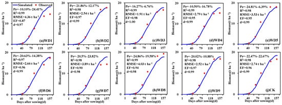 The development of the aboveground biomass of cotton was simulated and measured in all treatments (a–j) during the validation period (2022). The dots represent the measured data, and the line represents the simulated values. Three lower irrigation limits of 55%, 65%, and 75% FC were set at the SQS, and three lower irrigation limits of 60%, 70%, and 80% FC were set at the BLS. Nine treatments (WD1–WD9, i.e., (a–i)) were completely combined, and CK (j) was the control treatment.