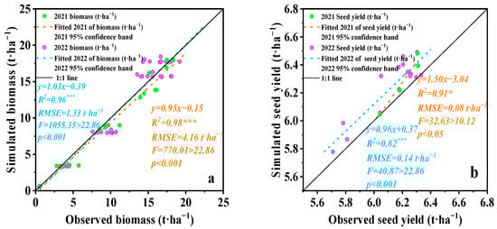 Comparison between the measured and simulated values of aboveground biomass (a) and seed cotton yield (b) in 2021 (calibration) and 2022 (validation). The dots represent the relationship between the observations and simulations. In the figure, * means p <= 0.05, *** means p <= 0.001.