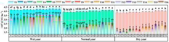 Comparison of the total costs and net revenue of cotton in wet years, normal years, and dry years. The blue bar chart shows the TC in wet years, the green bar chart shows the TC in normal years, and the red bar chart shows the TC in dry years. The colored bar chart in each subgraph shows the NR of each simulation process. Bars are the means + one standard error of the mean (n = 5). Different letters above the error bars indicate a significant difference at p < 0.05 according to the Duncan test.