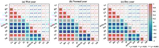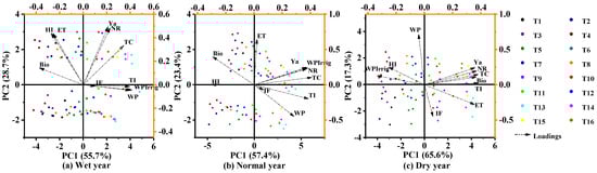 Principal component analysis (PCA) was employed to conduct a comprehensive evaluation of various indexes pertaining to cotton [39]. The first two components were deemed valid for the three scenarios, as their sum exceeded two-thirds of the total variance. In wet years, for instance, the first two components accounted for 97.95% of the total variation. PC1 showed a positive correlation with yield, Bio, ET, and TI, as well as a negative correlation with WPIrrig, WP, and HI. In PC2, which accounted for 12.12% of the total variance, IF, WPIrrig, and NR displayed a robust positive correlation, whereas TI, WPIrrig, and TC demonstrated a negative correlation (Table 6).