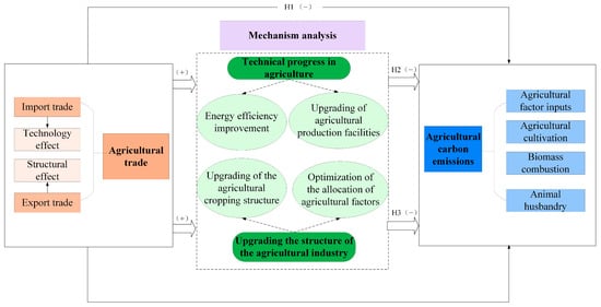 29]. In addition, there are green barriers in the agricultural trade process. To meet the importing country’s food green standards, agricultural producers must take the initiative to improve the green attributes of their products and reduce environmental pollution. This study explores the impacts of agricultural trade on agricultural carbon emissions from the aspects of scale and technology effects. The mechanistic analysis is shown in