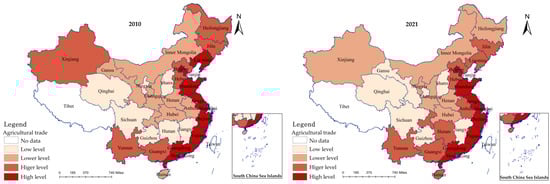 For feature fact analysis, we used Origin 2021, MATLAB R2022b, and ArcGIS 10.8 for visualization and analysis. First, we used Origin 2021 software to depict the trend in the level of trade in agricultural products from 2001 to 2023 to visualize the current status of trade in agricultural products. Secondly, we used MATLAB R2022b software to estimate kernel density and analyze the spatial distribution and trends of agricultural carbon emission levels in specific years. Finally, we used ArcGIS 10.8 software to characterize the trends and spatial distribution of agricultural trade and agricultural carbon emissions in different regions for specific years. Specifically, we categorized the levels of agricultural trade and agricultural carbon emissions into four groups: low level, lower level, higher level, and high level according to the 25th percentile, 50th percentile, and 75th percentile, respectively. On this basis, we used ArcGIS 10.8 to visualize and analyzed the spatial evolution trends of agricultural trade and agricultural carbon emissions in China in 2010 and 2021.