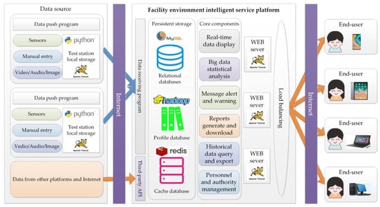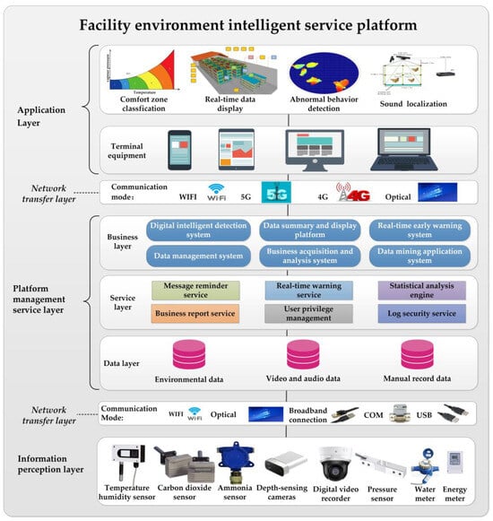 The construction of an intelligent service platform for a facility environment (Figure 1) is based on the architecture of the IoT, which can be mainly divided into four layers, including the information perception layer, network transfer layer, platform management service layer, and application layer.