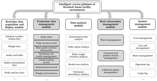 The functions implemented by the facility environment intelligent service platform are presented in Figure 4, including real-time data collection and display, data analysis, production data management, basic information management, and system management.