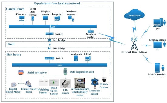 The architecture of the field network system is shown in Figure 7. Wireless routers transmit data to the cloud server for remote access. Various sensors in the poultry house collected data like power usage, water consumption, wind speed, CO2 levels, ammonia levels, temperature, and humidity. These sensors connected to local servers through serial port servers and DAM-3058F(I) (Beijing ART Technology Development Co., Ltd., Beijing, China, with eight channels of 0 mA to 20 mA as the current input and a 10 hz sampling frequency), DAQ cards, and then as LAN via switches. The cloud server receives and distributes data to remote users for viewing and management on personal computers, display screens, and mobile devices.