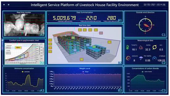 Real-time interface display of intelligent service platform (A1) for real-time monitoring; (A2) comfort zone in the psychrometric chart; (A3) Ammonia concentration; (B1) data summarization; (B2) environmental data at different locations of the chicken house; (B3) hens’ weight curve; and (C1, C2) environmental data outside the house; (C3) for CO2 levels.