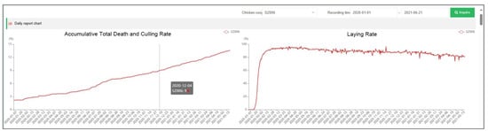 In the data analysis module of our system, Figure 10 shows the historical data query and display function for production data. The cumulative mortality rate (CMR) measures the total number of deaths over a period relative to the initial population of chickens. The equation for CMR is as follows: