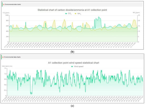 A1 collection points of environmental data from 7 July 2020 to 15 June 2020: (a) temperature and humidity statistical curve; (b) carbon dioxide and ammonia concentration statistical curve; and (c) wind speed statistical curve.