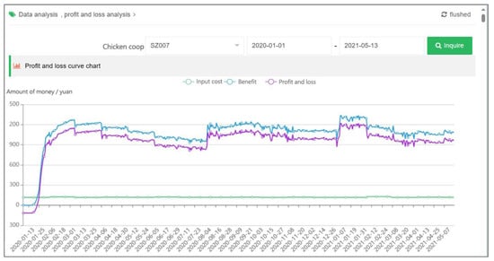 By systematically collecting production data, real-time analysis was conducted on expenses like water, electricity, and feed in large-scale poultry houses alongside income sources, such as eggs and culling. A calculation model was developed to generate a profit and loss curve, offering a daily production status chart for the chicken house. This aids farm management in understanding production efficiency. The use of data from production data management (introduced in Section 3.2), daily input costs, benefits, and P and L were calculated.