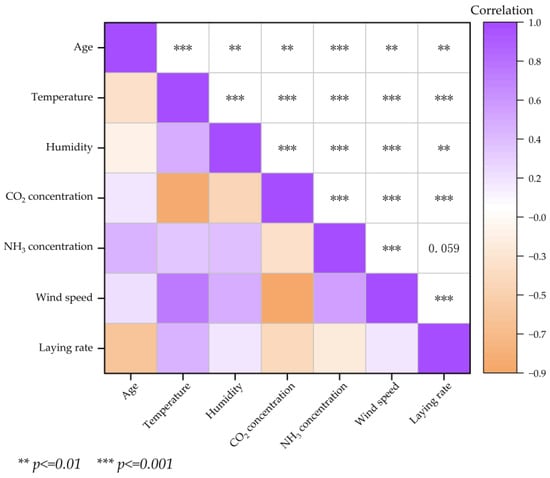 Correlation analysis between environmental parameters, chicken age, and egg production rate. Heatmap of Pearson correlation analysis. Color key: the color intensity represents the strength of the Pearson correlation coefficient, ranging from orange-red to purple. Positive correlation: darker shades of purple indicate a positive correlation. Negative correlation: darker shades of orange-red indicate a negative correlation.