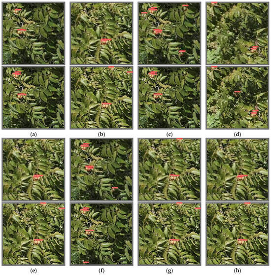 In the 2× downsampled detection results (Table 2), after integrating Walnut-SR, the P of all object detection models significantly increased, while the R saw only a modest improvement. In the 4× downsampled detection results (Table 3), both P and R of all models were notably improved after integrating Walnut-SR. Combined with Figure 11, it can be seen that the distinction between walnut fruits in the 2× downsampled LR images before and after reconstruction is not very significant. Walnut-SR mainly performs edge sharpening and texture reconstruction on the walnut fruits. Therefore, the Walnut-SR module has limited impact on improving the model’s ability to identify positive samples, and more complex model structures or additional training data may be needed to further enhance the detection accuracy of the object detection model. The reconstruction results for the 4× downsampled images are much better, effectively restoring the characteristic information of the walnut fruits. Thus, the Walnut-SR module not only improved the detection accuracy of the object detection models but also alleviated the issue of missed detections.