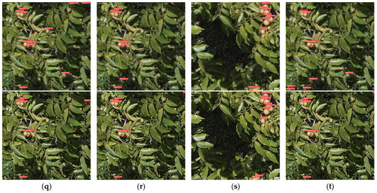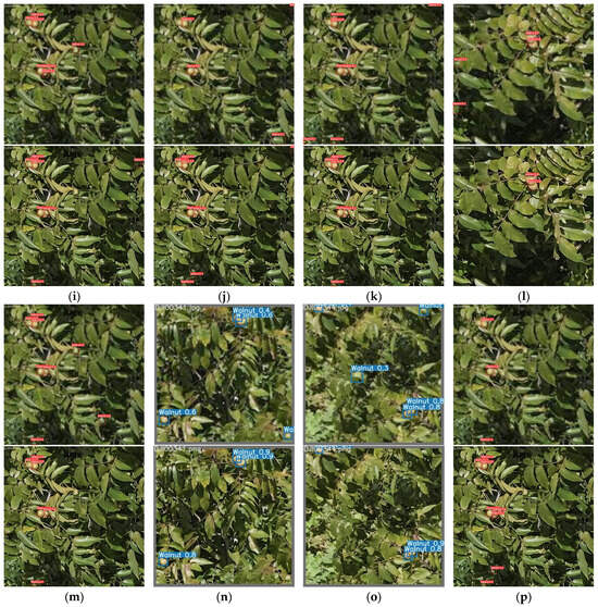 Detection comparison of a series of mainstream object detection models before and after integrating Walnut-SR. The first row of results for each model shows the detection results without Walnut-SR, while the second row shows the detection results after integrating Walnut-SR. (a–z) represent YOLOv3, YOLOv3-SPP, YOLOv3-tiny, YOLOv5n, YOLOv5s, YOLOv5m, YOLOv5l, YOLOv5x, YOLOv6n, YOLOv6s, YOLOv6m, YOLOv6l, YOLOv6x, YOLOv7, YOLOv7-tiny, YOLOv8n, YOLOv8s, YOLOv8m, YOLOv8l, YOLOv8x, YOLOv9t, YOLOv9s, YOLOv9m, YOLOv9c, w-YOLOt0, w-YOLOt1, respectively.