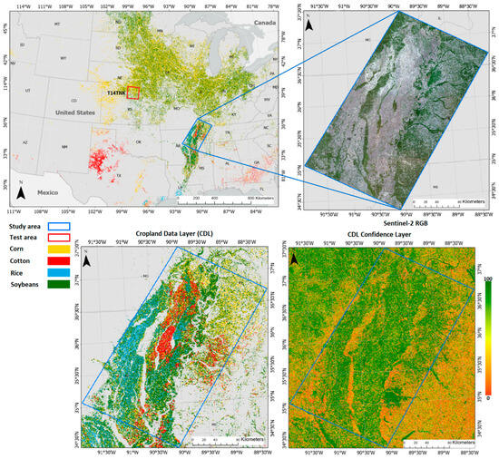 Geographic overview and data layers used in the study. The top-left map shows the study area within the Mississippi Delta (blue rectangle) and T14TNK test area (red rectangle). The top-right image displays Sentinel-2 composite imagery from May 2021. The bottom-left map illustrates the distribution of crops in the CDL. The bottom-right map depicts the CDL confidence layer, indicating the confidence values associated with the CDL.