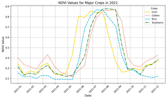 Utilizing Google Earth Engine (GEE) [21,23], we processed monthly minimum composite datasets from May to September, comprising 872 tiles in Mississippi Delta and 29 tiles in T14TNK. This period aligns with the peak growing season in the study area, as indicated by the Normalized Difference Vegetation Index (NDVI) [25] in Figure 2. To provide a comprehensive view of vegetation dynamics, NDVI curves for the entire year of 2021 were generated, contrasting growing and non-growing periods. The NDVI for each major crop was calculated using Sentinel-2 satellite imagery, with cloud masking applied to remove cloudy pixels. The data were composited into 15-day intervals over 2021, and NDVI was computed. Stratified random sampling selected 10,000 sample points for each major crop based on the CDL with 100% confidence interval, extracting NDVI values to provide a detailed temporal profile for each crop.